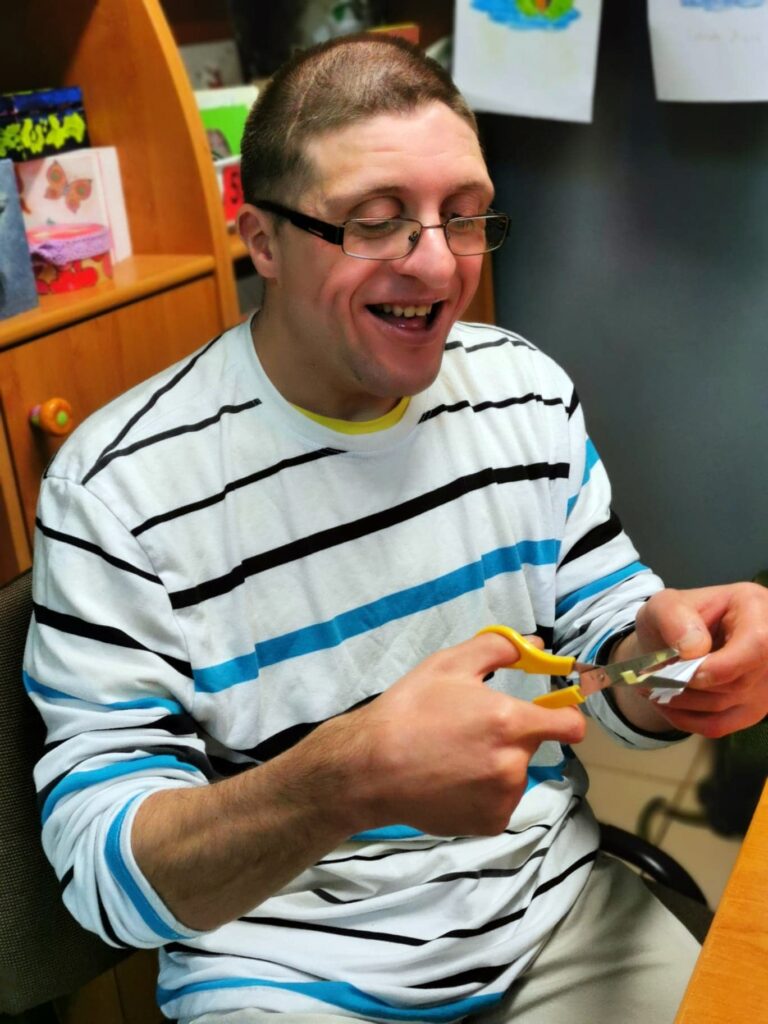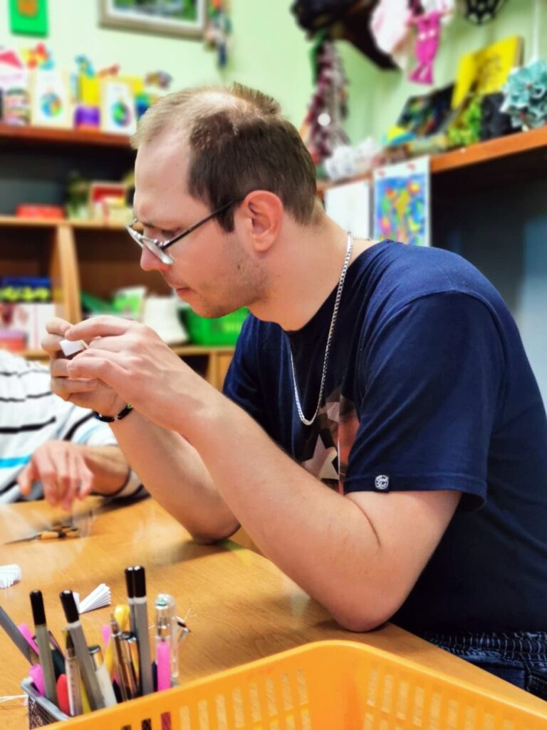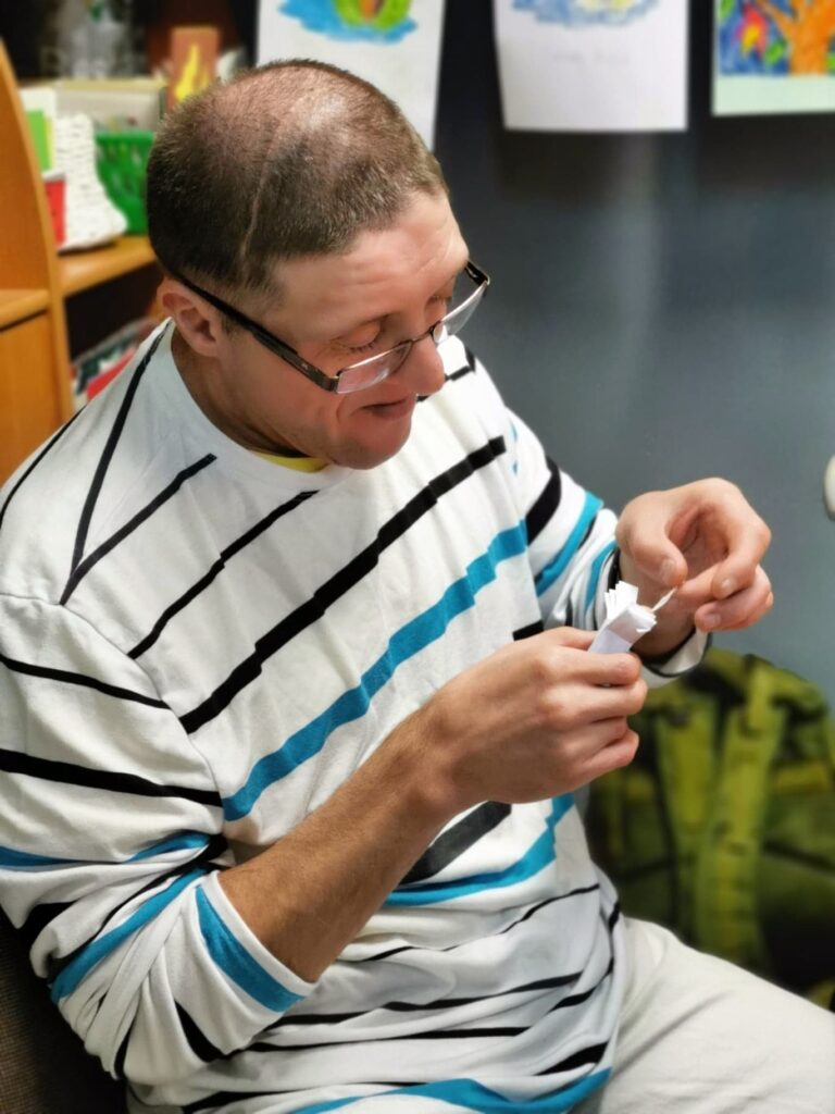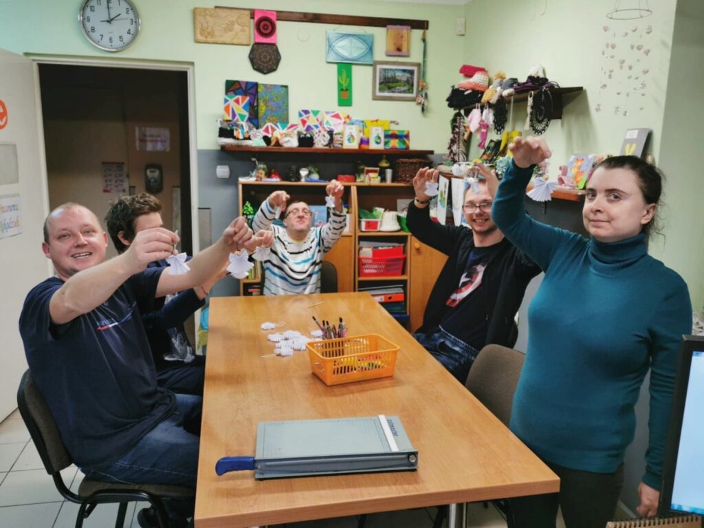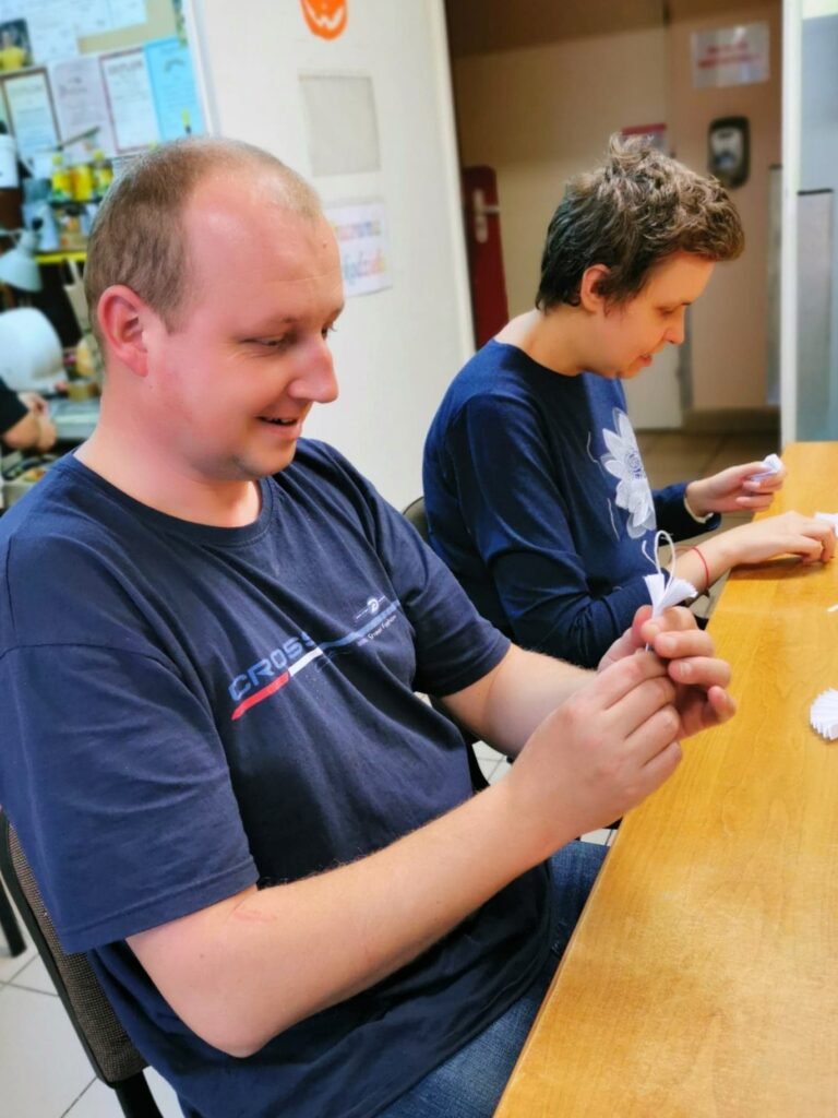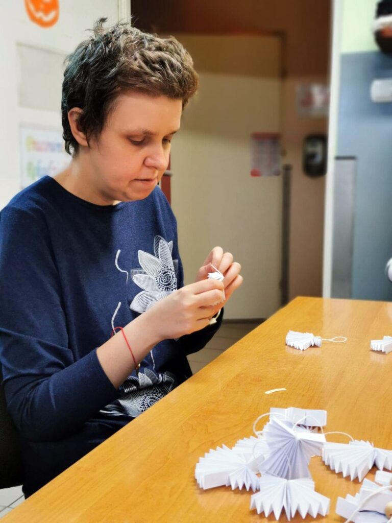 Podczas zajęć w pracowni rękodzieła uczestnicy przygotowywali zawieszki na choinkę w kształcie aniołków