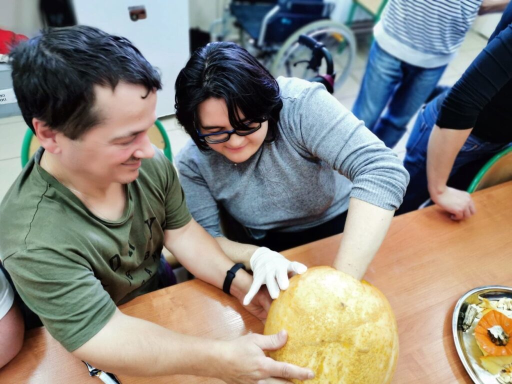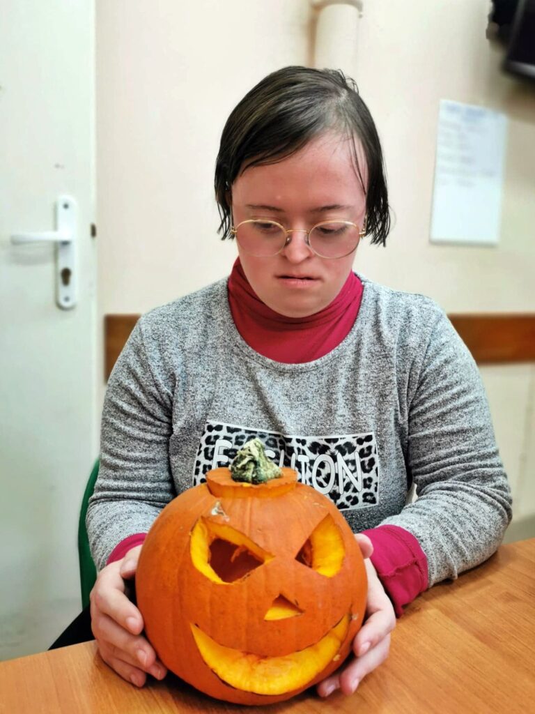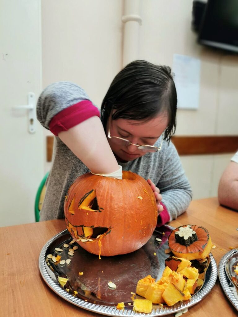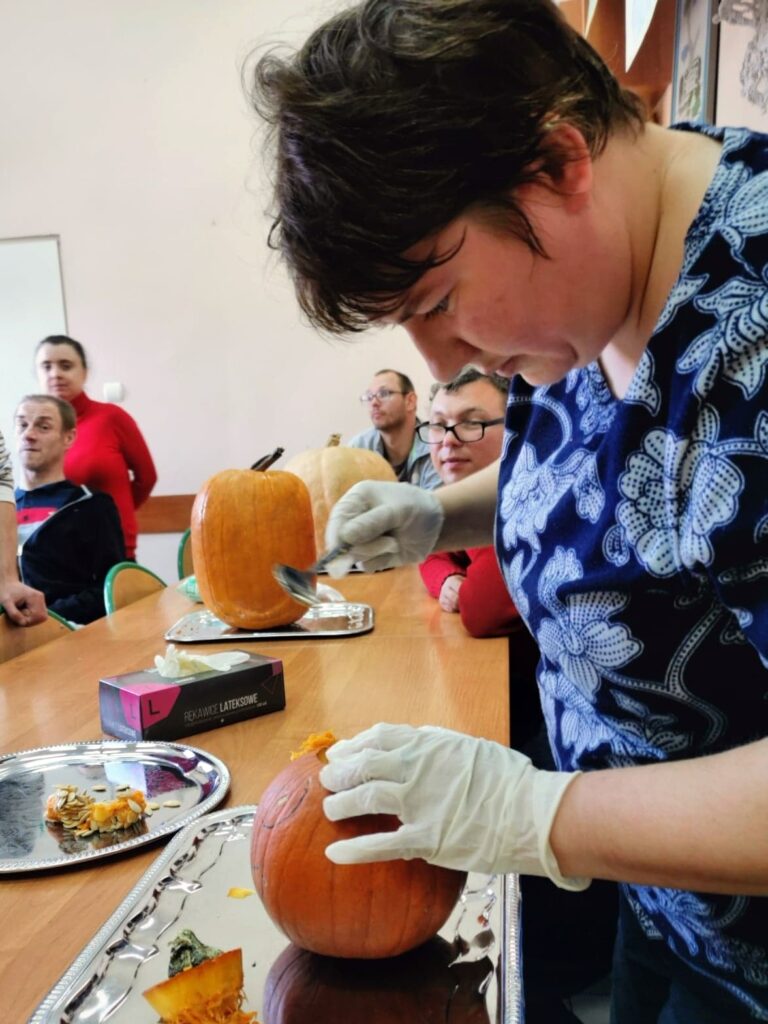 Najbardziej wyczekiwanym punktem dnia była zabawa z wycinaniem dyni, które teraz pięknie prezentują się w naszym warsztatowym kąciku tematycznym.