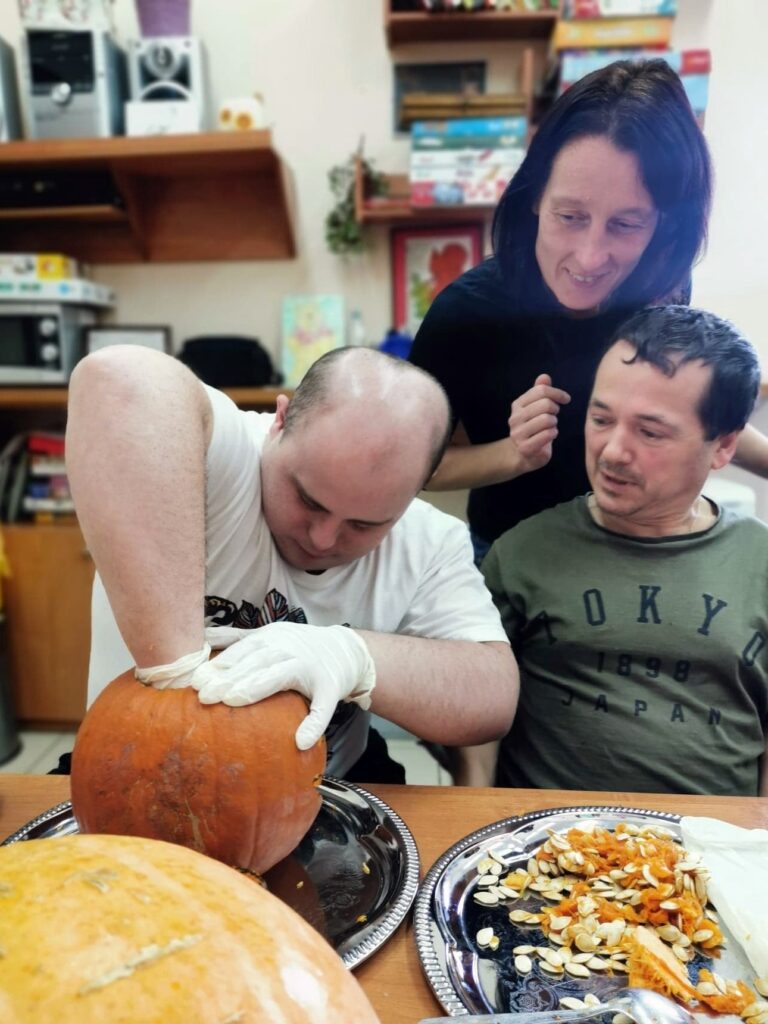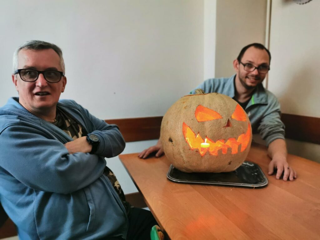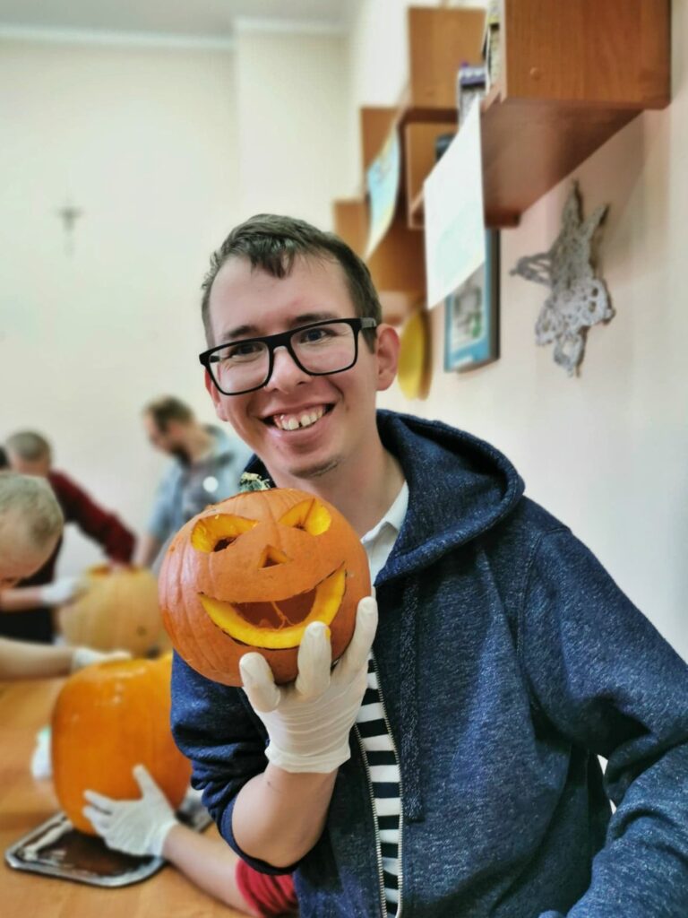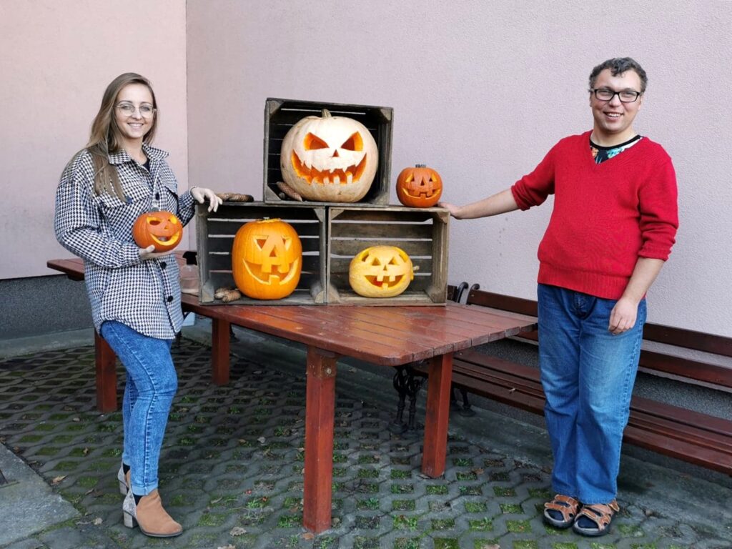 Najbardziej wyczekiwanym punktem dnia była zabawa z wycinaniem dyni, które teraz pięknie prezentują się w naszym warsztatowym kąciku tematycznym.