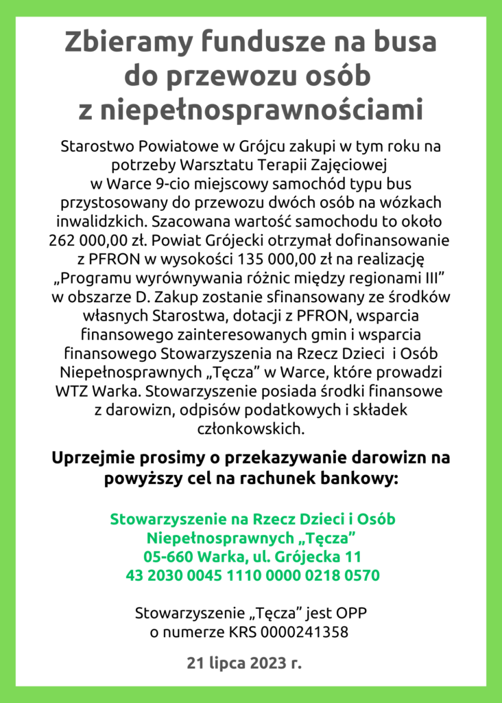 Starostwo Powiatowe w Grójcu zakupi w tym roku na potrzeby Warsztatu Terapii Zajęciowej w Warce 9-cio miejscowy samochód typu bus przystosowany do przewozu dwóch osób na wózkach inwalidzkich. Szacowana wartość samochodu to około 262 000,00 zł. Powiat Grójecki otrzymał dofinansowanie z Państwowego Funduszu Rehabilitacji Osób Niepełnosprawnych w wysokości 135 000,00 zł na realizację „Programu wyrównywania różnic między regionami III” w obszarze D. Zakup zostanie sfinansowany ze środków własnych Starostwa, dotacji z PFRON, wsparcia finansowego zainteresowanych gmin i wsparcia finansowego Stowarzyszenia na Rzecz Dzieci i Osób Niepełnosprawnych „Tęcza” w Warce, które prowadzi WTZ Warka. Stowarzyszenie posiada środki finansowe z darowizn, odpisów podatkowych i składek członkowskich.